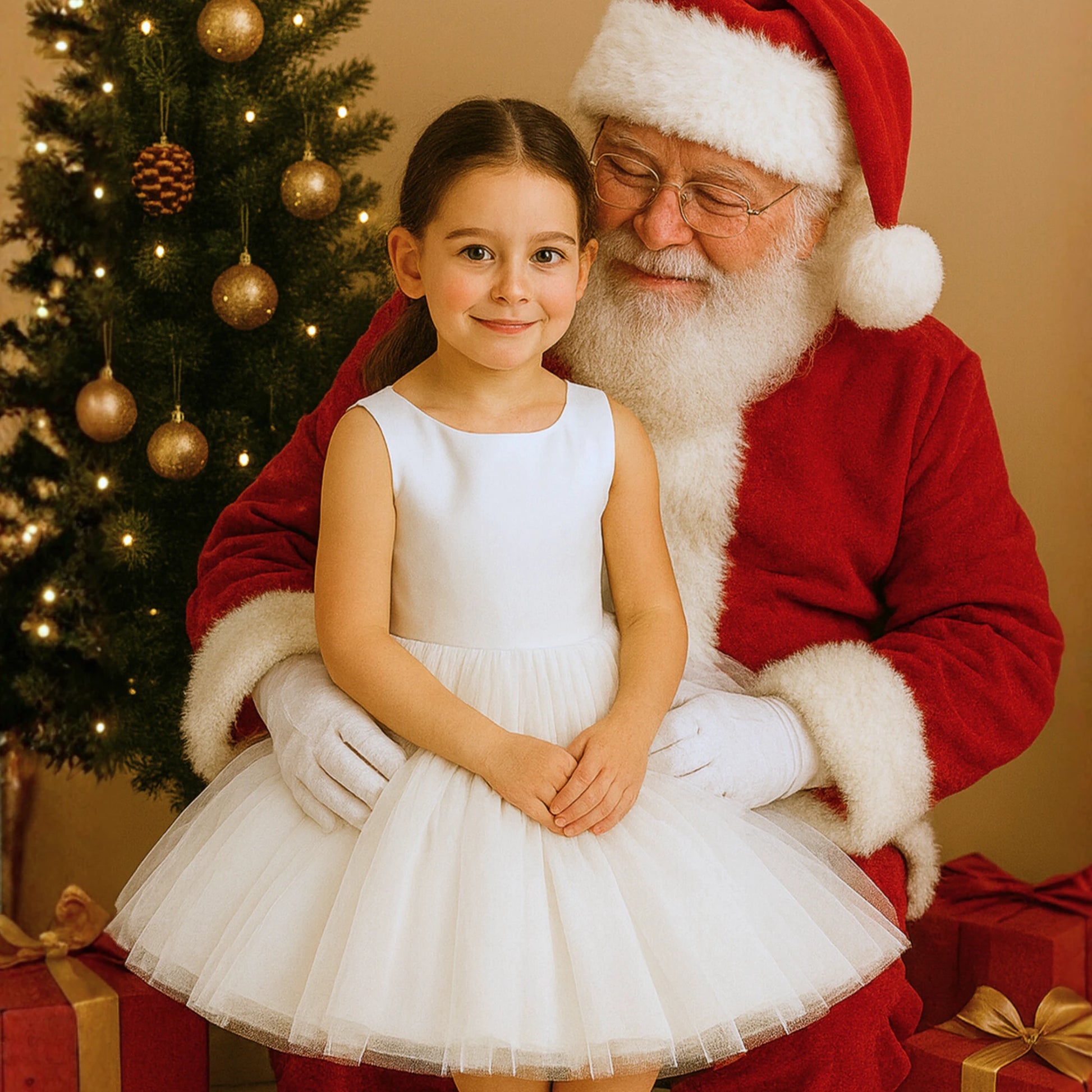 Make her Christmas magical with this stunning white, knee-length tutu dress, designed to be beautifully poofy, lightweight, and perfect for warm summer festive days. The extra-wide tulle skirt creates that dreamy princess silhouette every little girl loves — airy, fluffy, and full of bounce with every step.