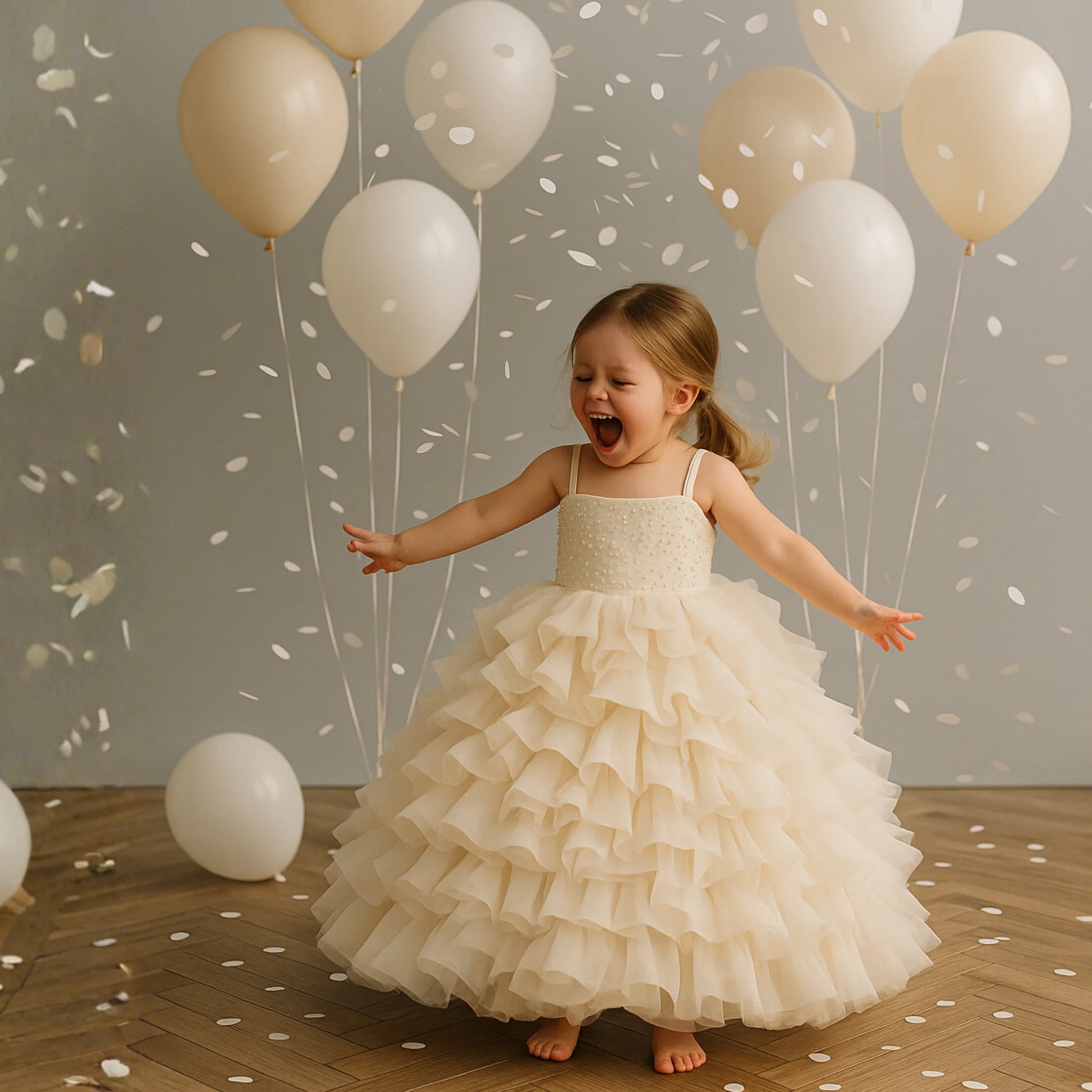 Wrap your little girl in pure elegance with this breathtaking ankle-length ruffled organza dress, designed for magical moments and unforgettable celebrations. The cascading organza layers create a full, dreamy silhouette that moves beautifully with every twirl, giving her the true princess experience.